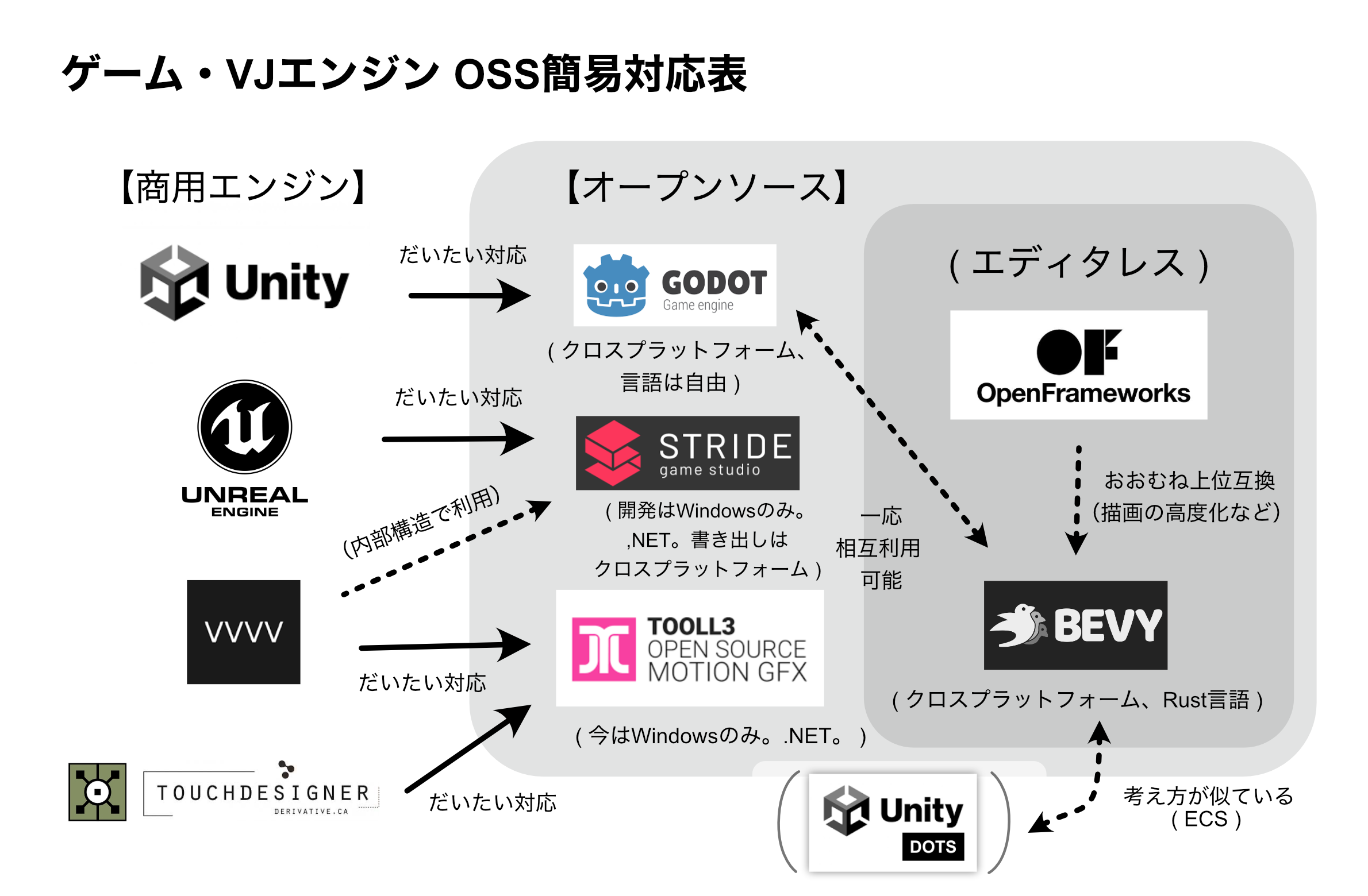 正直載せなくてもいいくらいではあったのですが、OpenFrameworksはよくVVVVやTouch Designerと同じ界隈で広く利用されていること、また、BevyはUnity DOTSと思想が似ていること、そして標準エディタがないだけで、描画エンジンや開発フレームワークとしてのポテンシャルが高いことを考慮に入れて表に載せました。