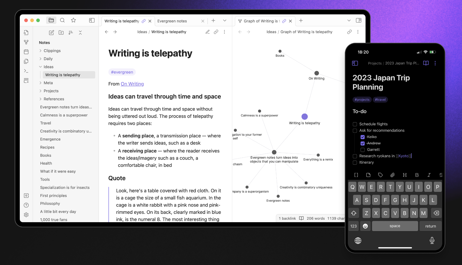 Logseqも、Obsidianと同じローカルファーストのツールです3。つまり、特に課金などは必要ないし、Obisidianと同じようにパソコンやスマホから使え、自分の好きなツールで同期することができます。