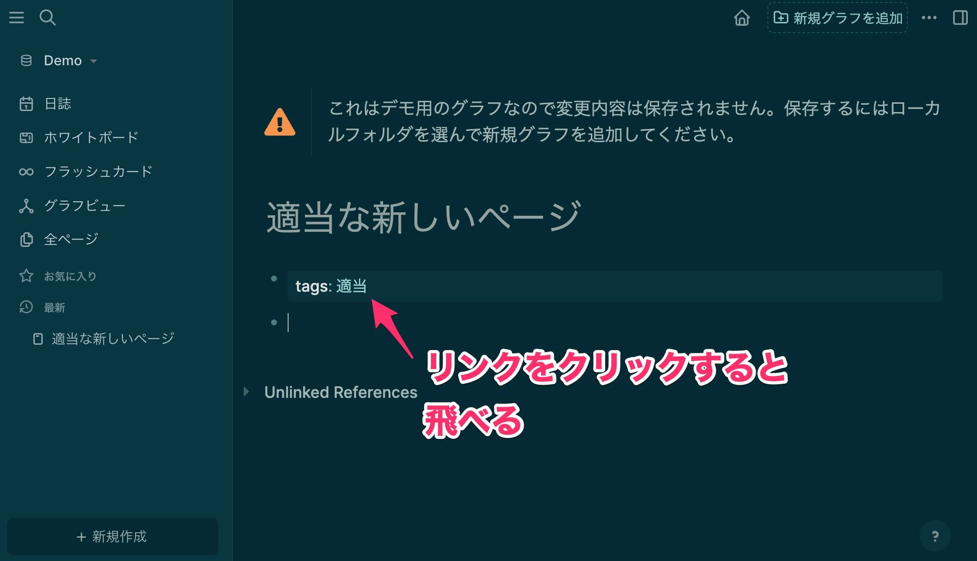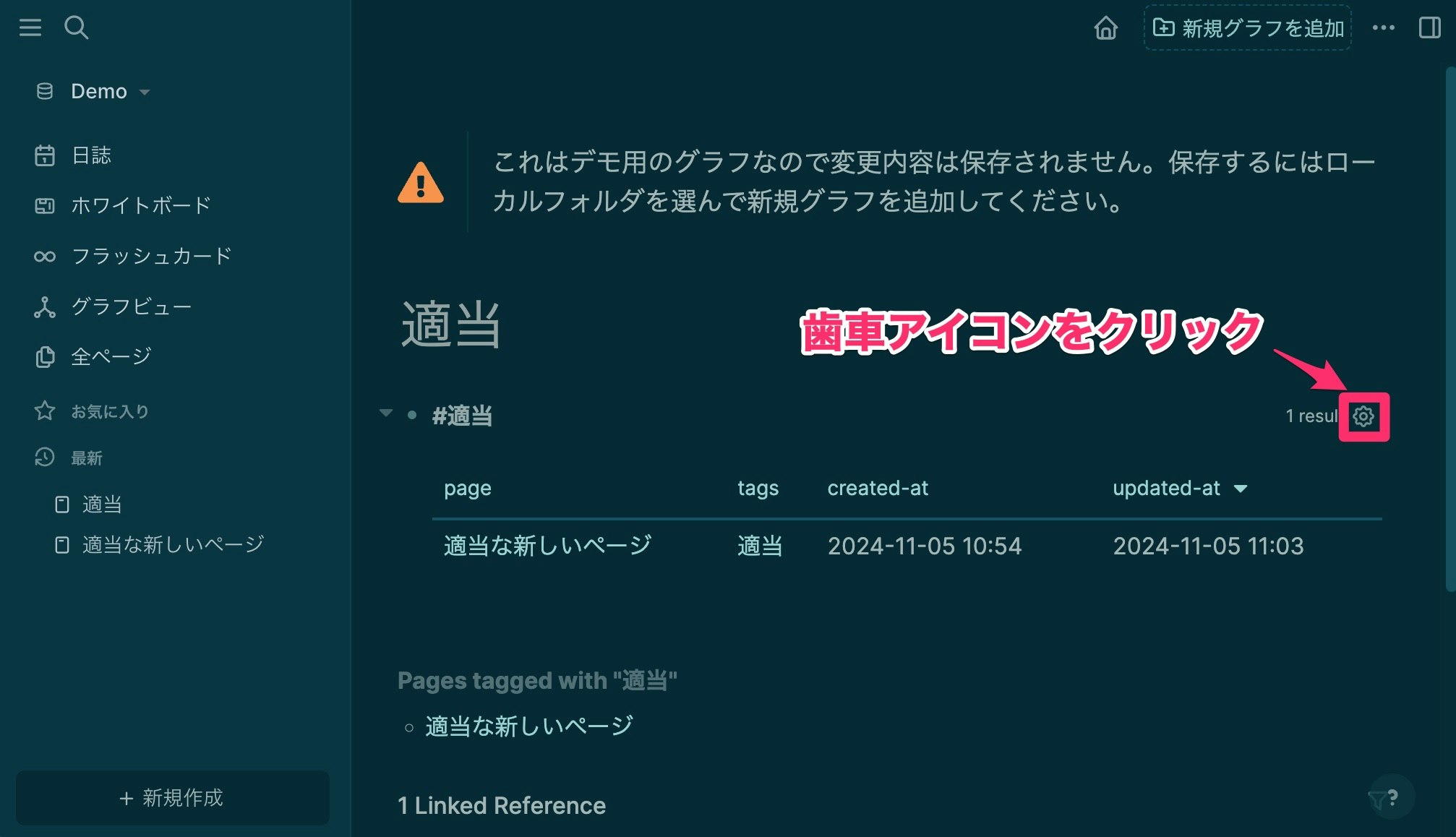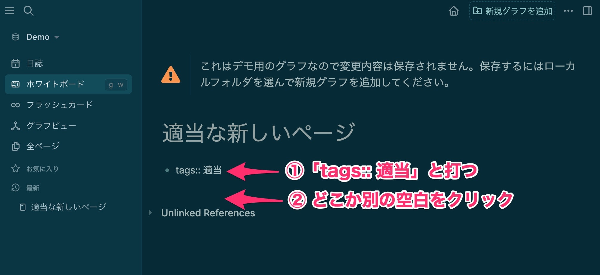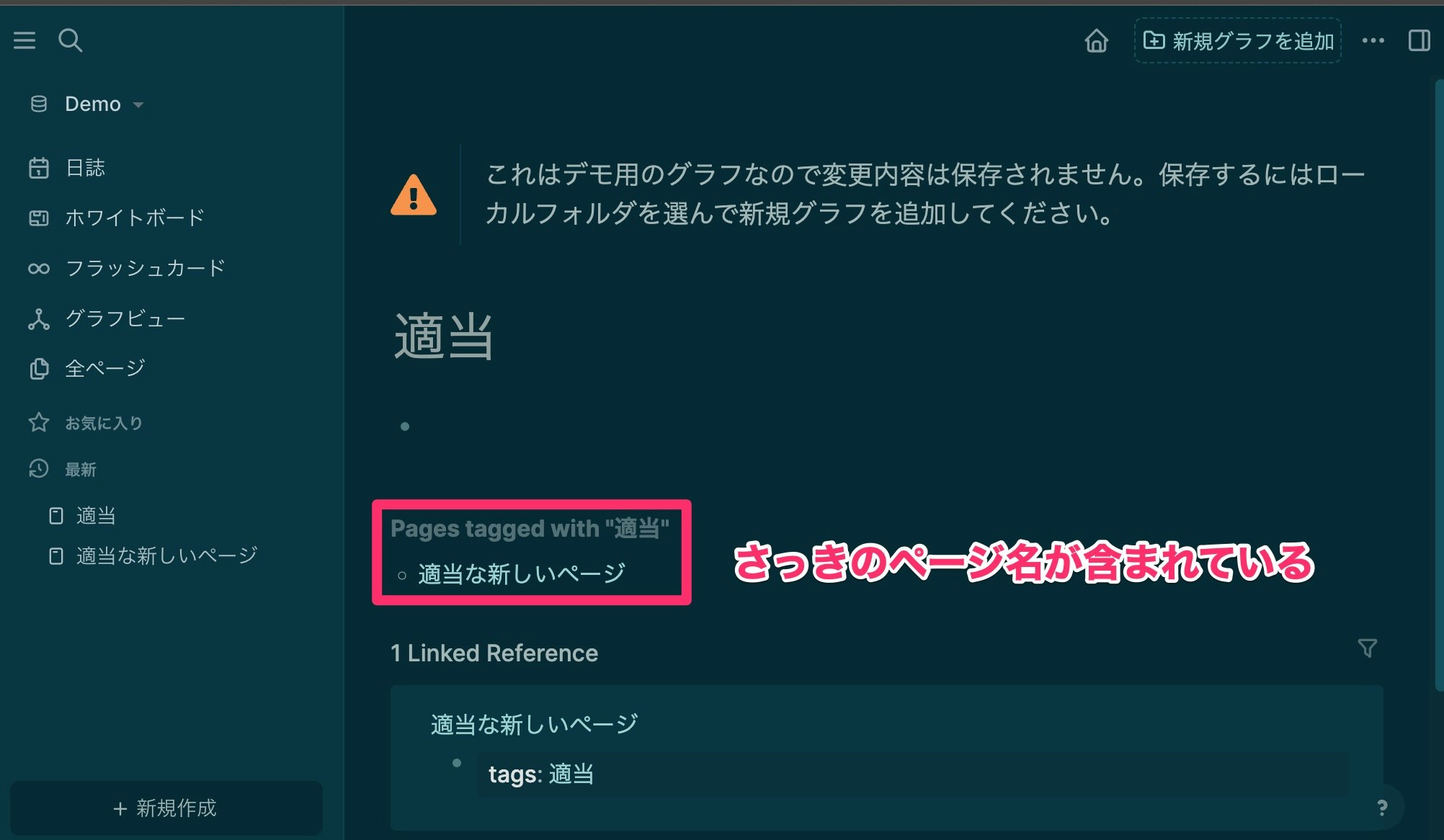 ページの最初の段落に、tags:: 適当と打ちます。(半角スペースを忘れずに!)
