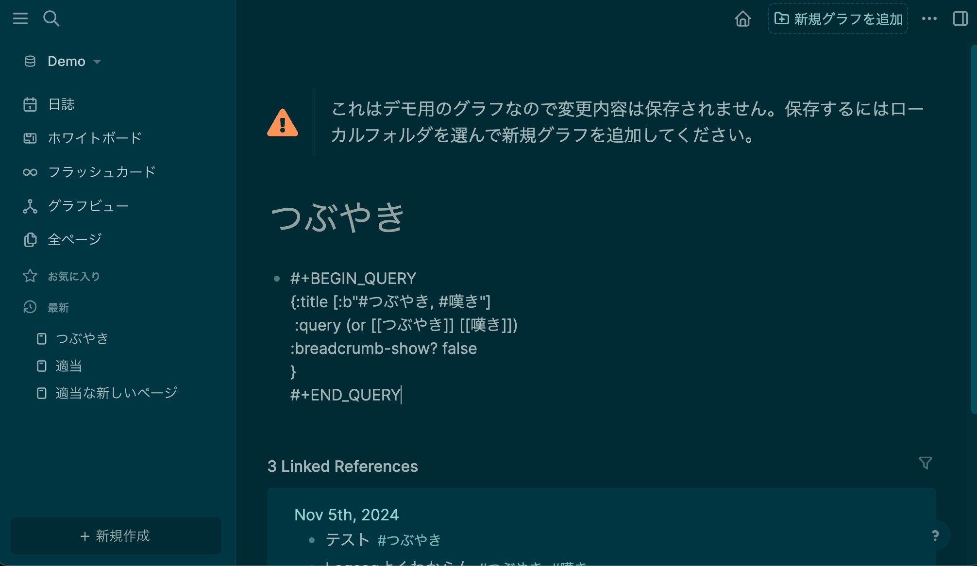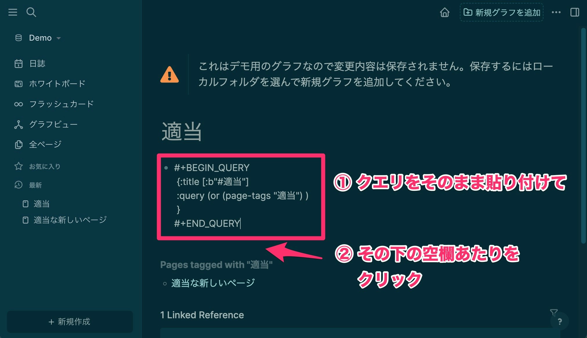 ではここからがLogseqの真骨頂というべきなのですが、この「適当」というページに、クエリ (Advanced Query) というものを書いてみます。