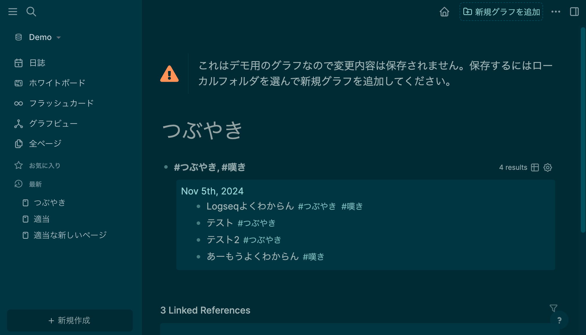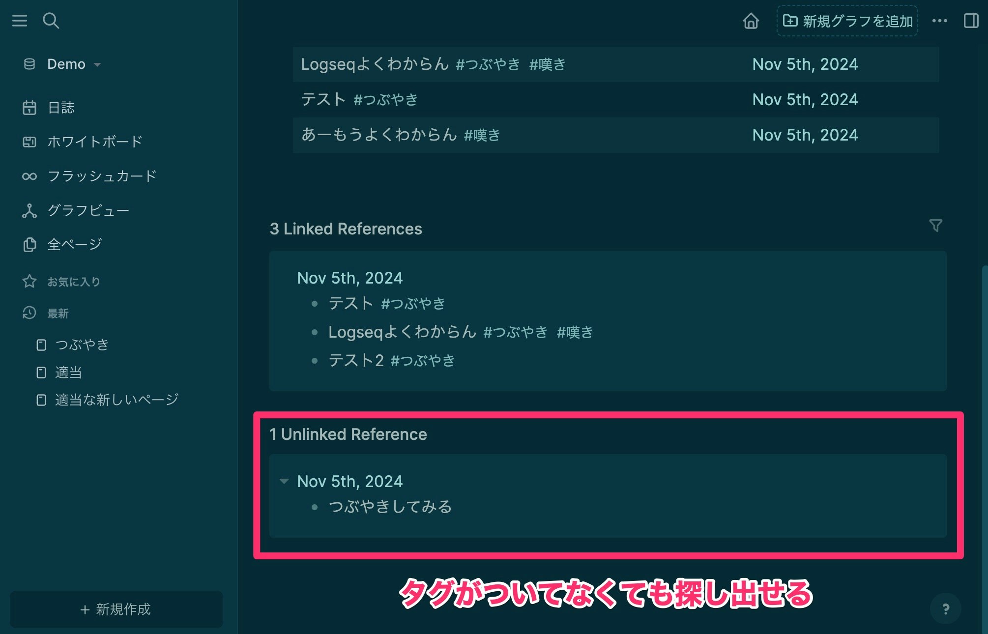 ちなみにこのハッシュタグみたいなものも実は必須ではなくて、ページを作るとそのページタイトルの言葉(例えば つぶやき)が自動的に検索されて、「Unlinked References」(非リンク参照)という欄にまとめられます。これもLogseqの便利なところです。