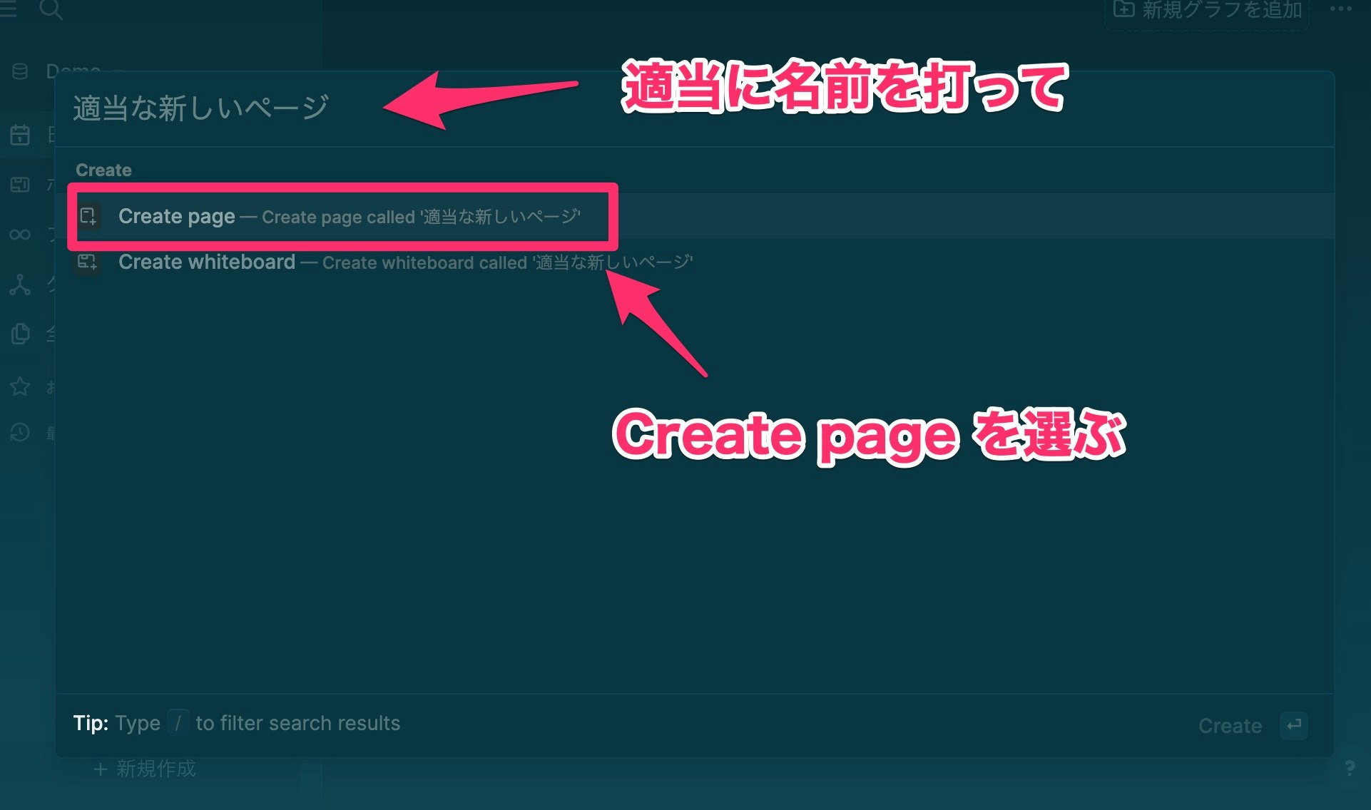 左下に「+新規作成」というボタンがあるので、こちらを使って、好きな名前で新規ページを作ります。