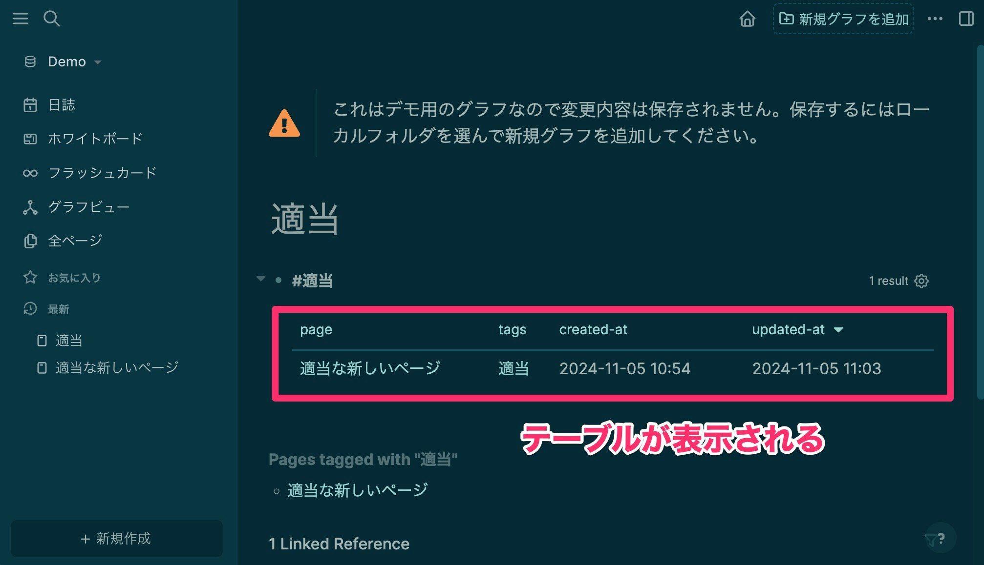 もうおわかりかと思うのですが、実はページに付けた属性がこの表には表示されます。属性というのは、先ほどつけた tags:: のように、ページの冒頭に xxx:: の形式で入力したものです。