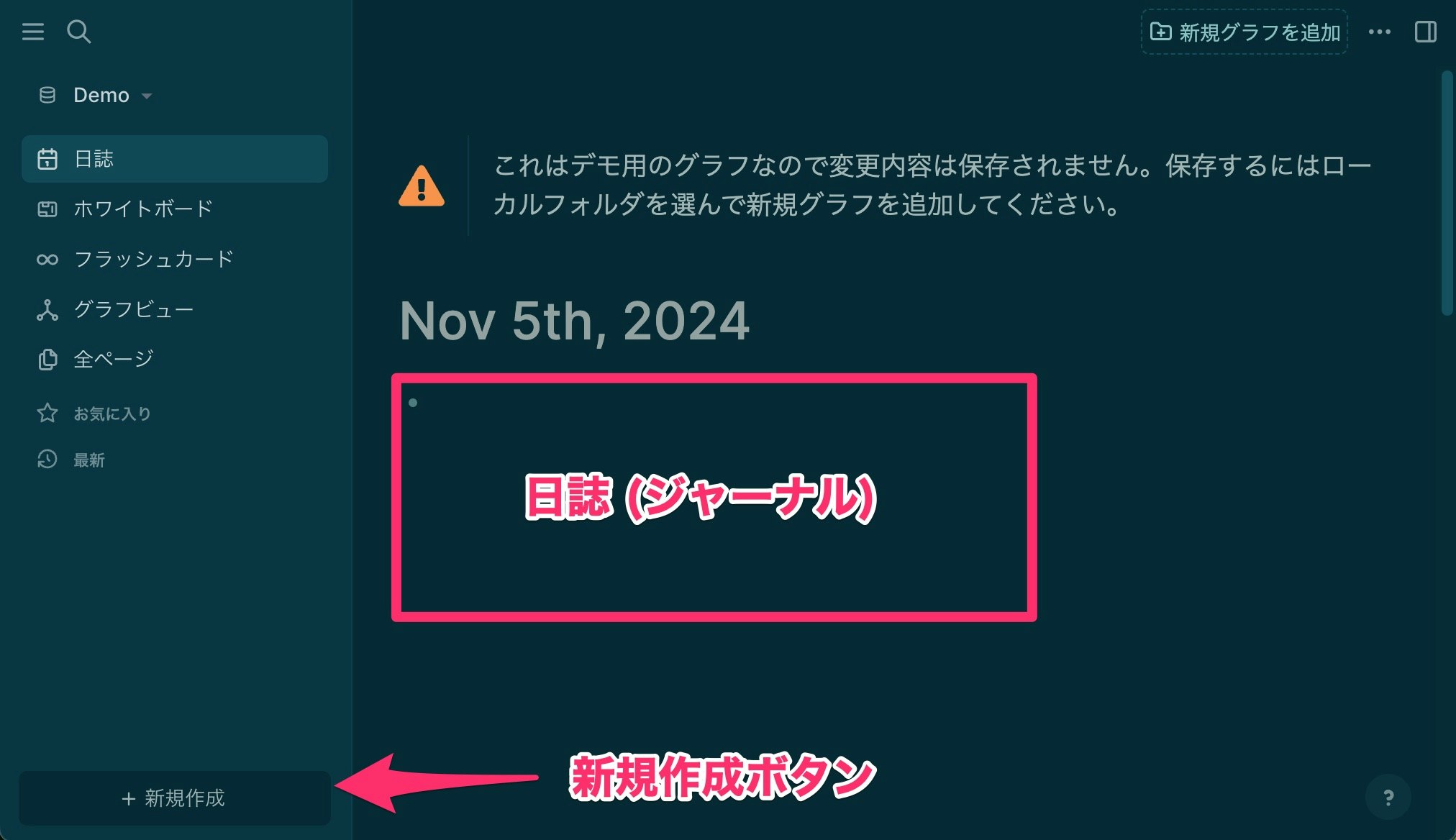 Logseqは、開くとすぐ 日誌(ジャーナル) が表示されますが、ここではひとまず無視しましょう。